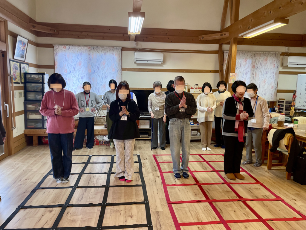 その後、24ますのネットを2枚並べて「ふまねっと運動」をしました。歌いながら頭を使いながらする、ふまねっとはやっぱり楽しくて面白く盛り上がりました。